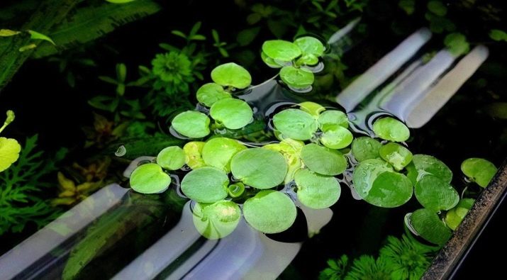 - Pennywort. Hydrocotyl is considered a hygrophilous representative of the umbrella family. Its main characteristics include rapid growth and unpretentiousness in content. This plant is used as a decorative for the aquarium and the coast of the reservoir. Such a bright lawn has the ability to protect the fish from the harm of sunlight and to shelter fry, which are not able to protect themselves. The pennywort has a long stalk about 50 centimeters long. The foliage is roundish in light green, having a diameter of 4 centimeters. Leaflets have some similarities with water lilies.In the flowering phase, the plant is covered with small white flowers.
