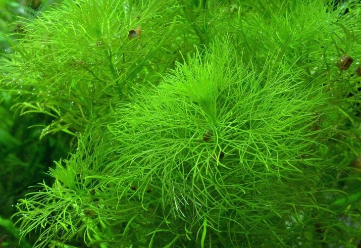 - Hornwort submerged. This type of algae belongs to perennials. It floats on the water surface, as it has no roots. The stem of the plant is long, needle-type and rather small. This alga is considered ideal for aquarium maintenance, usually fry are hidden in it. Hornwort loves bright lighting, feels great in moderately warm and cold aquariums.