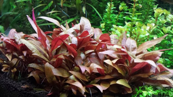- Alternantera. This plant is popular with aquarists, as it is an externally attractive long-stemmed specimen. Its foliage is painted in bright shades, from pink to dark purple. Scourges of the alternanters spread along the water surface, as they are long. This representative of the flora is able to grow throughout the year. If the plant is completely immersed in liquid, then its growth slows down.