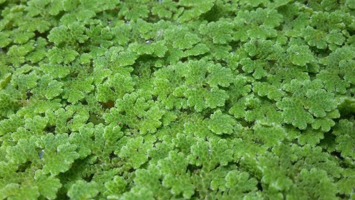 - Azolla Caroline. Fern is able to develop well on the water surface. Several plants together carpeted surface. On the stalk of the fern is fragile and delicate foliage. Parts that are above the water have a blue-green color, and immersed in water have a pinkish-green color.Fern is able to develop exclusively in the warm season, in winter it falls into hibernation.