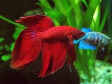 Fighting fish cockerel decoration of any aquarium: bright color, speed of movement, fluttering veil tail - it is difficult to take your eyes off this instance. Coloring varies from bright red to blue-black, body length up to 6 cm.