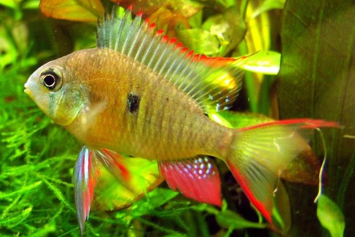 - Apistograms Ramirezi they also belong to miniature species of cichlids and rarely grow up to 5 cm. Fishes are distinguished by a good disposition and loyal attitude to aquarium algae, which is why they often settle in herbalists.