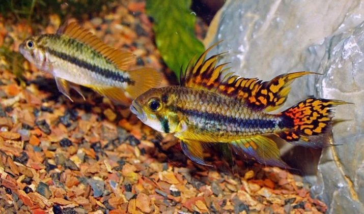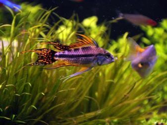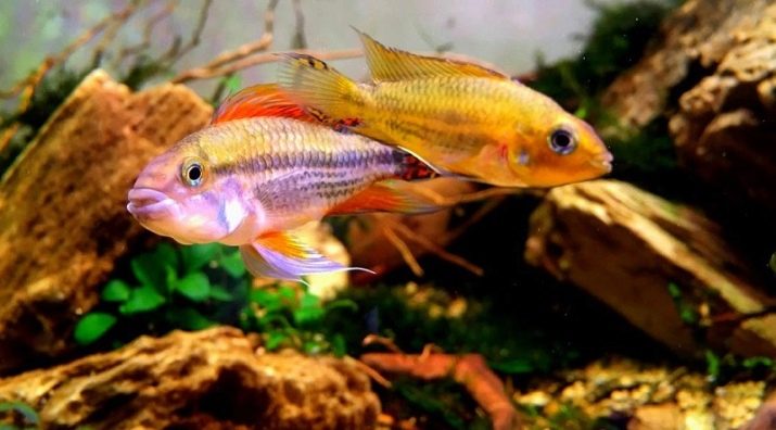 The cockatoo apistogram, although a cichlid, is not as aggressive as the other varieties, and by temperament it is a clear phlegmatic. The best "neighbors" in the aquarium will be fishes, similar in size and character: tetras, barbs, angelfish, catfish corridors, ancistruses, laliuses, haracinovye. You can contain a cockatoo in conjunction with live-bearers: Molly, Swordsmen, Pecilia. A guppy apistogram can perceive any “small fry” such as zebrafish, so this tandem is undesirable. And also it’s not worth risking and settling a cockatoo along with aggressors like discus, turquoise acara, and Severum tsikhlazoma. But such cichlids, like the Princess of Burundi, the handsome chromis and the apistogram agassitsa, will gladly settle with the cockatoo and will not fight with it.