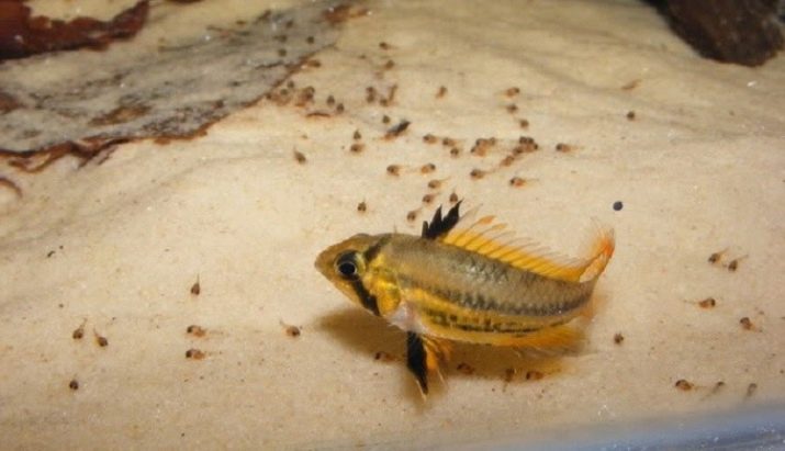 In order for young growth to grow and develop successfully, it is very important to maintain a stable state of the surrounding aquatic environment during the first three weeks of life. Small cockatoo apistograms grow quite quickly. You can start feeding them with microscopic worms, live dust, artemia nauplii, and also feed boiled yolks of chicken eggs. Like any other living creature, the cockatoo apistogram needs care, proper nutrition and proper conditions. You must understand that you have assumed responsibility for the whole mini-ecosystem by acquiring an aquarium. If you do everything right and on time, the cockatoo apistogram can please you with its bright appearance and interesting behavior up to 5 years.