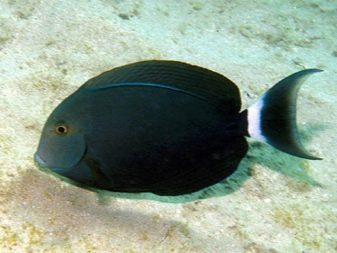 The caudal fin resembles a crescent. The color of the surgeon is almost coal, has an olive hue. A wide white stripe runs across the base of the tail. The size of this fish is 35-40 cm.