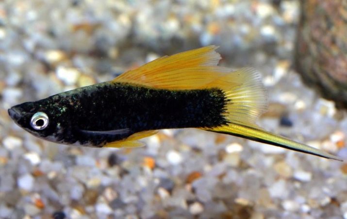 - Black Molly (Molliesia). The favorite of many aquarists. It has a coal-black body color, a crest-like dorsal fin, and the tail fin is similar to a lyre or a cut semicircle. The size of the black molly is a maximum of 10 cm, the females are larger than the males.
