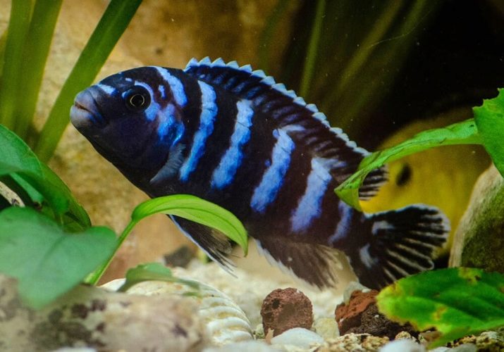 A cobalt zebra prefers to hide, so it needs a large aquarium. It is advisable to create a rocky landscape, which will include shelters, grottoes and caves. The male has one feature: when he is very afraid of something, he changes color, which makes it easy to confuse with a female.