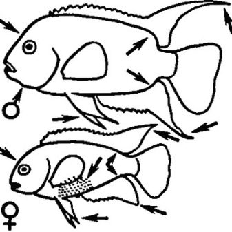 Many people are interested in how to distinguish a female cichlid from a male. If heterosexual individuals have pronounced distinctive features regarding the structure of the body and color, then it will not be difficult to determine the female in front of you or the male. If the fish belong to monomorphic species, then to determine their gender, a thorough examination will have to be carried out.