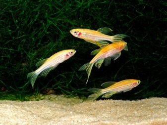 It has an interesting coloring: a greenish back, sides and abdomen are silver-green, on the body there are longitudinal stripes of bright turquoise, bordered by orange. Closer to the caudal fin, these strips merge. The fins of zebrafish can be either yellowish gray or reddish-orange.