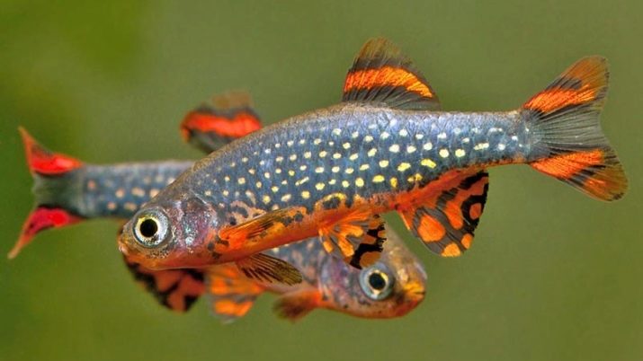 Another name is Microsampling Galaxy. It is easy to understand why she was so called, just by looking at her color: on the gray-green background of the body the "stars" are scattered randomly - bright yellow spots. The abdomen of the galaxy is orange-red, stripes of the same color are on the fins.
