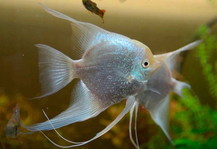 Experienced aquarists consider this breed one of the most expressive. The body of the scalar is covered with small scales of saturated pearl color. When the rays of light hit the fish, they create bright and expressive overflows.