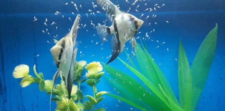 In order for the fry to appear from them, you need to wait a week. Now the fish can swim and eat on their own. The process of growth and maturation is very fast. 7-8 months will be enough for the fish to become sexually mature. At the beginning of its development, scalars are very sensitive to water quality. It is recommended that you often clean the soil in the aquarium to maintain cleanliness.