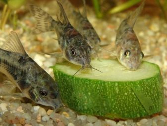 - Feeding. You need to give food 1 time per day. Pygmies can be fed both live (daphnia, tubule, artemia), and dry food in the form of cereals, granules, tablets. It is necessary to feed finely chopped fresh cucumber, lettuce and dandelion leaves, which must be scalded with boiling water and finely chopped.