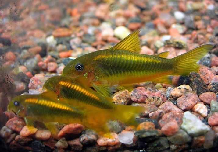 Golden corridor is a small fish. Females grow in length no more than 7 cm, males - 5-6 cm. It’s easy to distinguish a female from a male - females look larger and fuller, males look slimmer. The dorsal fin is rounded in females and pointed in males. Corridors differ in their color. On the shelves you can find these fish in bronze, green, white (albino) and black.