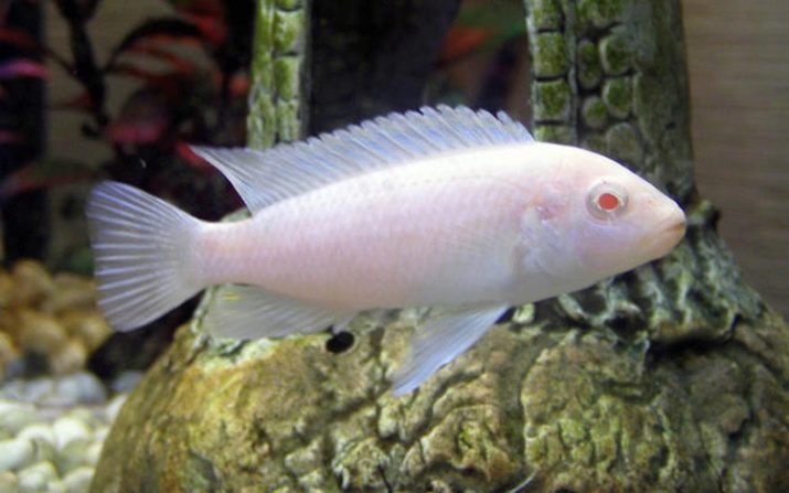 Snow prince fish can have not only white, but also a light bluish tint. At a young age, aquarium pets are slightly darker. Due to the fact that these animals are albinos, their eyes are saturated with red.