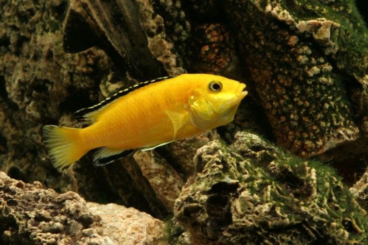 Labidochromeis yellow is popular. As you can already guess by the name, the body of the fish has a juicy yellow tone. There is no difference at all between the male and the female, with the exception of the dark area of the eyes: they are painted the same. The fins are black, and there is a white line only on the dorsal protrusion. Body length reaches 0.09 m.
