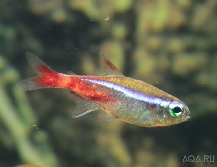 Females of neons are larger in comparison with males (about 0.5 cm longer). Their belly is more prominent than that of the “boys”, and in the middle of the body you can see the bend of the shiny strip characteristic of the appearance of these fish. Males are flatter and with an even sideband without any hint of bends.