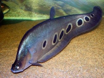 The Indian eye-shaped knife differs from its congeners by its external coloring (gray-silver color), the presence of small scales and a miniature dorsal fin. In the lower part of the body there are a number of black spots resembling eyes.
