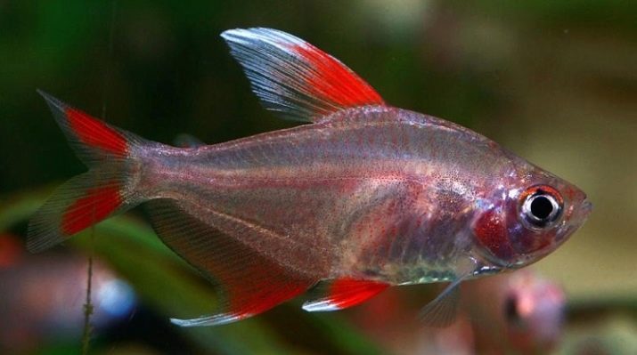 In length, this species reaches 5 cm.The color has a silver hue, the pointed dorsal fin has a milky white color, and the tail fin is painted in red-orange tones. Other fins are white with a red border.