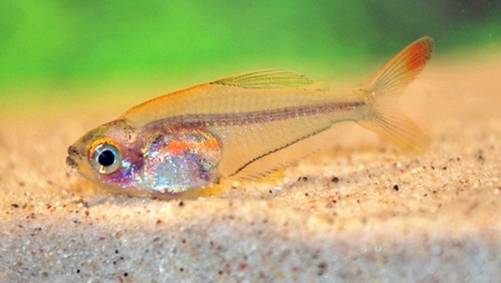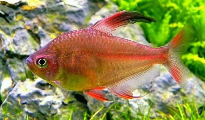 It has almost the same proportions as the common ornatus, however, it is painted in a light pink shade, the upper part has a more saturated color, the abdomen casts a golden color. The dorsal, caudal and anal fins glisten with scarlet tones. The size of the red poultry is 4-5 cm.