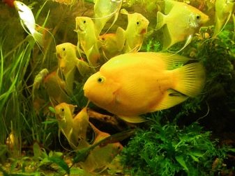 Such a neighborhood is only possible in an aquarium of at least 200 liters. It is also not recommended to settle next to cichlids of small fish less than 5 cm long, for example, neons, guppies, gracilis, because they can also become the object of food of voracious parrots.