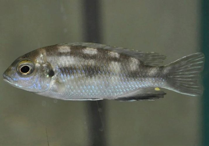 - Interruptus. Beautiful cichlid. The color of the males is ink-blue, bright blue spots are scattered on the top of the back and on the muzzle, the border on the tail and fins is white. The females are golden yellow, solid. Fries are born beige.