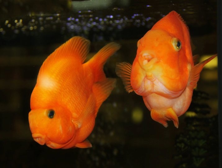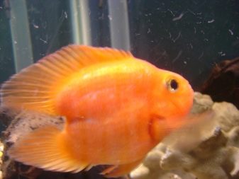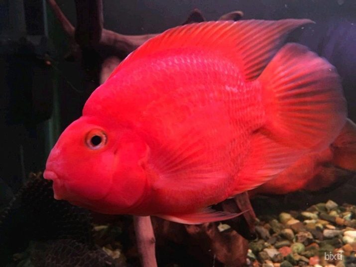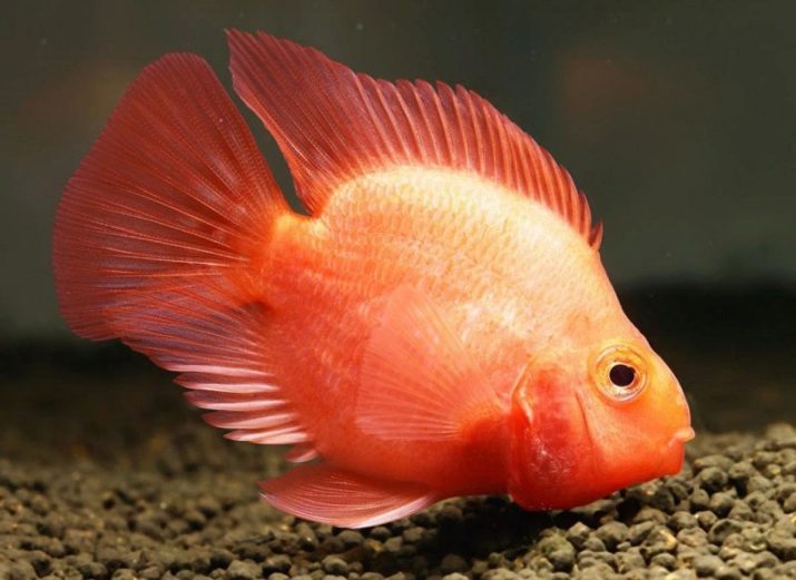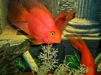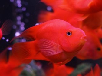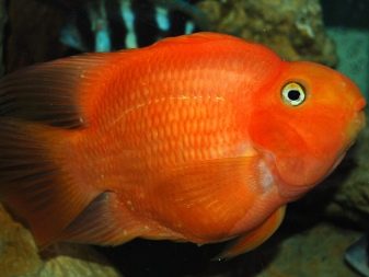 However, the most popular is the red parrot fish. It is distinguished by a bright red color with orange flashes, a humpbacked nose that looks like a beak, and fangs protruding forward. Adults grow up to 25 cm and are suitable for joint maintenance with fish of other species.