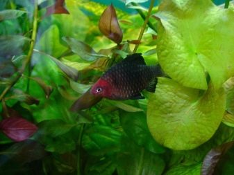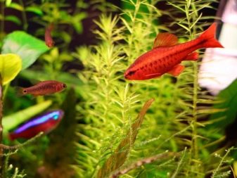 In the aquarium for such beauties there should be a powerful aerator and filter, you need to feed cherry fish 2-3 times a day. Industrial or dry food is given in small portions. This is a non-aggressive underwater resident who gets along well with ordinary neons.