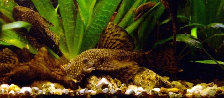 It belongs to pterigoplichtomas. This "pet" can happily absorb vegetation, it is well adjacent to many other aquarium inhabitants. With all the love of algae, sometimes at night their predatory nature wakes up in them, they begin to eat up the scales of slow fish. True, his housing needs are immodest - a pair of such catfish will need a 400 liter vessel. The snags laid at the bottom will become a source for the appearance of growths that the fish will eat.