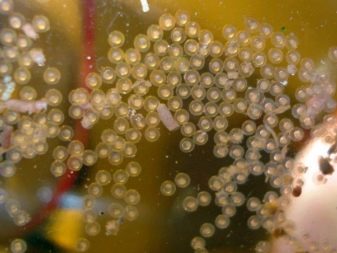 From caviar, babies appear two days later and the first 2 days feed on their own reserves (yolk sac). After that, they can be fed with live dust, ciliates, washed with boiled yolk. As they grow, small crustaceans (cyclops) will become food for fry, nauplii will be the larvae of brine shrimp, and small primary cavernous worms will be rotifers.