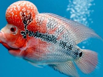 - Flower horn with a reddish color and dark dots that create bizarre patterns on the body. Males have a rather large growth on the forehead, a saturated color and several long rays on the fins. Today, there are several species of this fish.