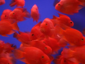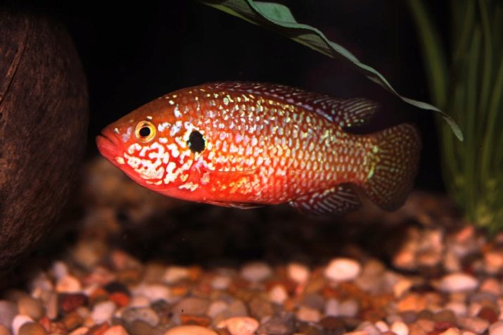 - Pelvicachromis pulcher or cichlid parrot has an elongated, slightly flattened body of yellow-brown color with a scarlet speck on the belly and small bright points on the fins. When excited or during spawning, the color becomes more saturated. Parrots grow relatively small, males - about 10 cm, and females - up to 7 cm. Average life expectancy is about 5 years. It has a rather peaceful character.