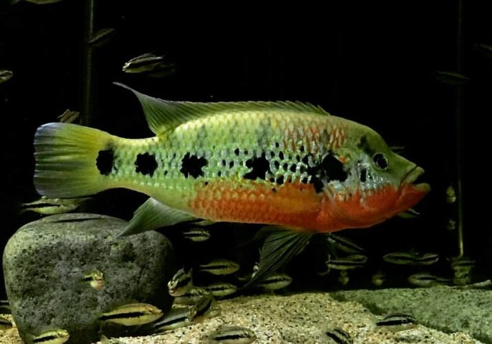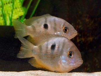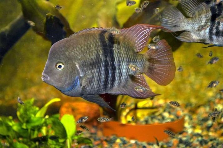 Cichlids are distinguished by an extremely aggressive nature, both to representatives of other species and to relatives. Males zealously guard their territory and help females raise offspring. Aquarium cichlids are quite capable of remembering the face of the owner. When approaching, they swim to the glass, they can even take food from their hands.