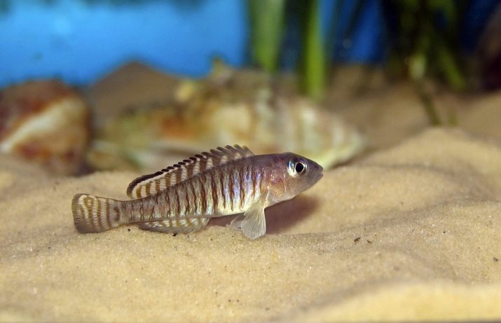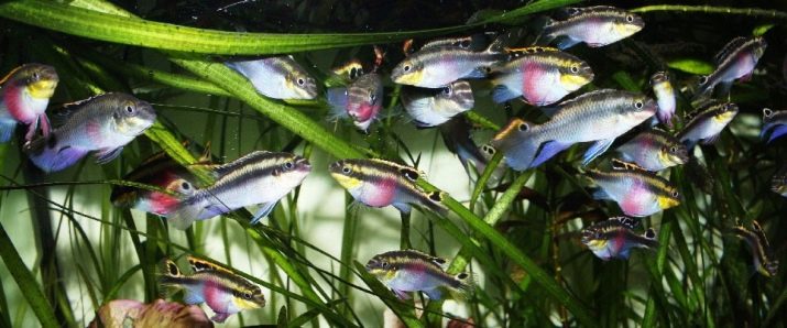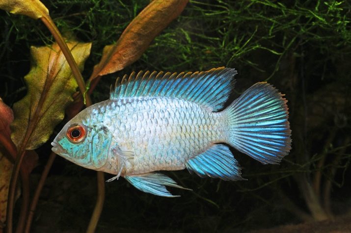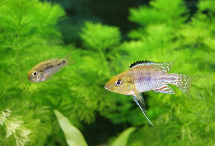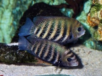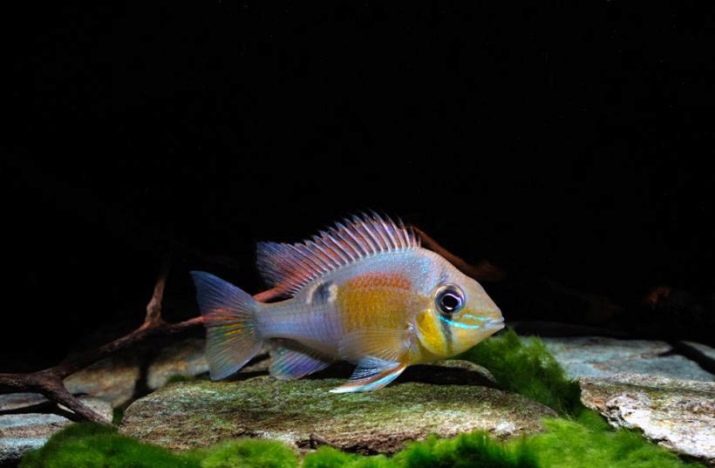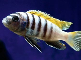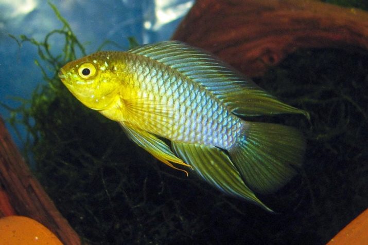 - Cichlid umbrella - a dwarf species, the length of the fish is only 5-6 cm. The color is blue or yellow-blue, in males the colors are much brighter than in females. The dorsal and anal fins are elongated. Fish are distinguished by a rather peaceful nature.