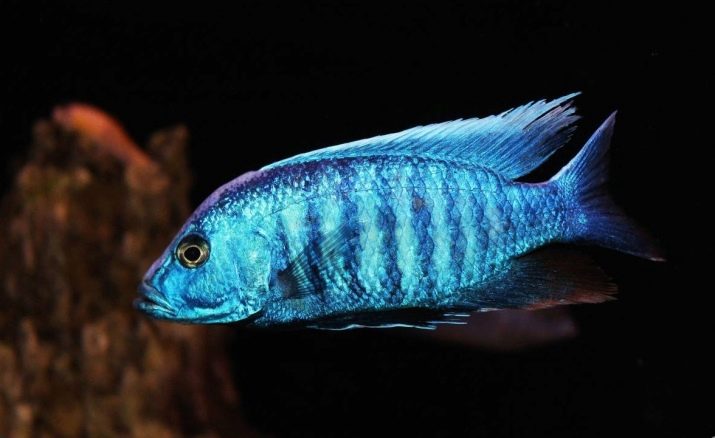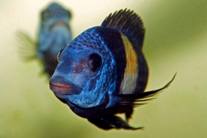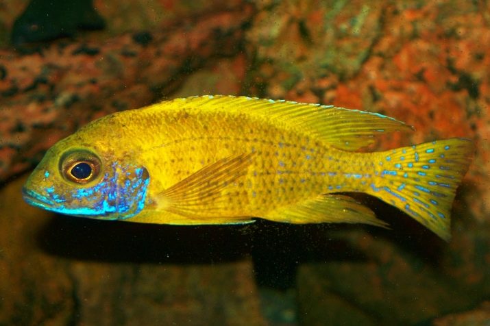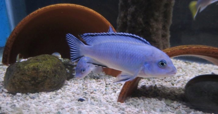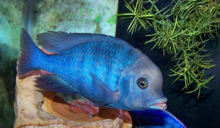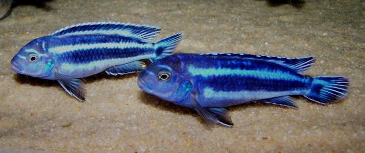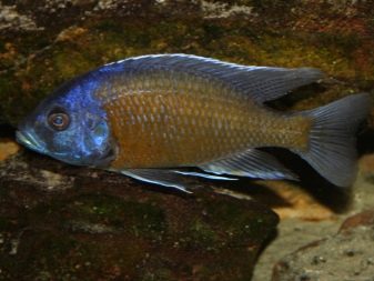 - Haplochromis cornflower - inhabitant of lake Malawi. It differs in an unusual blue color. The lower fin of the fish has a yellowish color, the dorsal fin is different in length, and on it, like on the tail, there are several small yellow spots. Adult individuals reach 20 cm, both males and females.