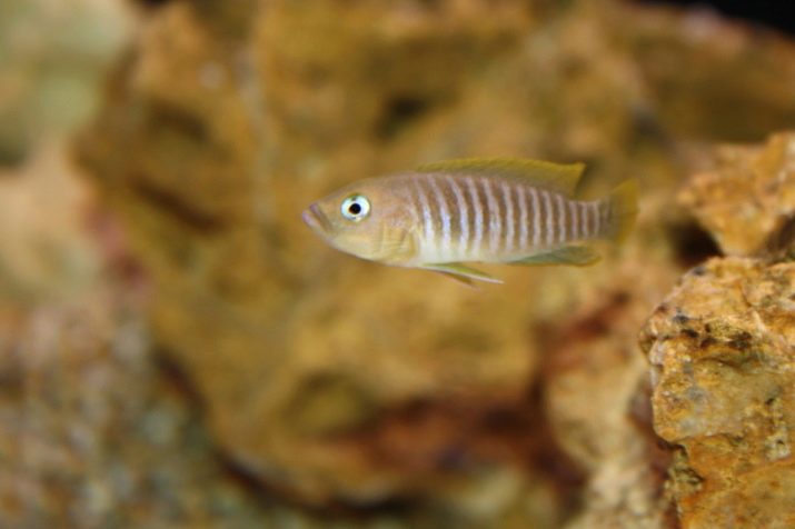 - Pseudotrophaeus Lombardo It has a yellow-golden or yellow-brown color, in some cases not very distinct stripes are visible on the sides. The fins are cast in a light blue tone, the anal is decorated with yellow dots, and the dorsal has a white border. The length of the fish reaches 15 cm.