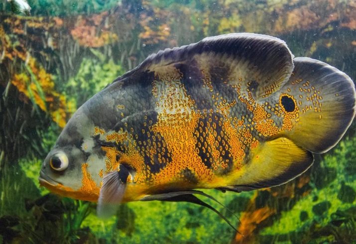 - Oscar - A rather large fish with a reddish-brick color and the presence of dark spots. The fins are rounded and dark in color.