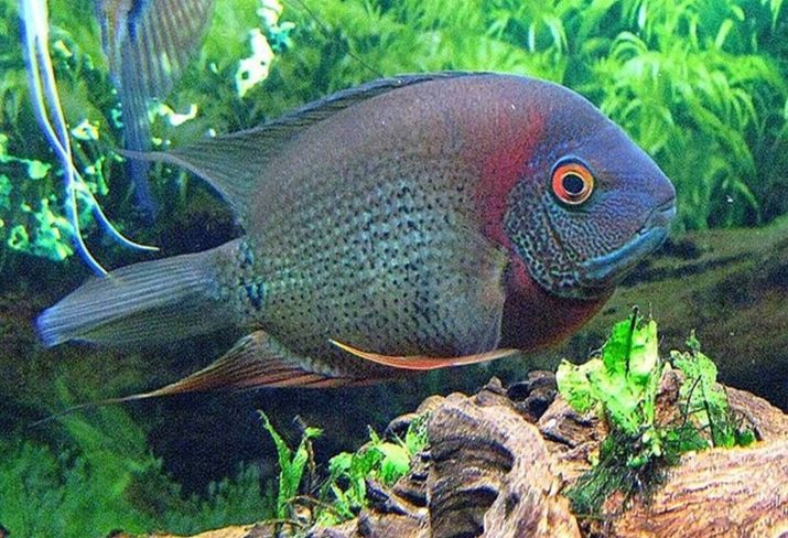 - Severum Efasciatus It has an oval-shaped body compressed on the sides. The color of the fish is blue or bluish-gray, the males behind the head have a section colored in red. The dorsal and anal fins stretch along the entire body; in males, they have a more elongated shape and red color. Dark transverse stripes are located on the sides. The character of the fish is quite peaceful.