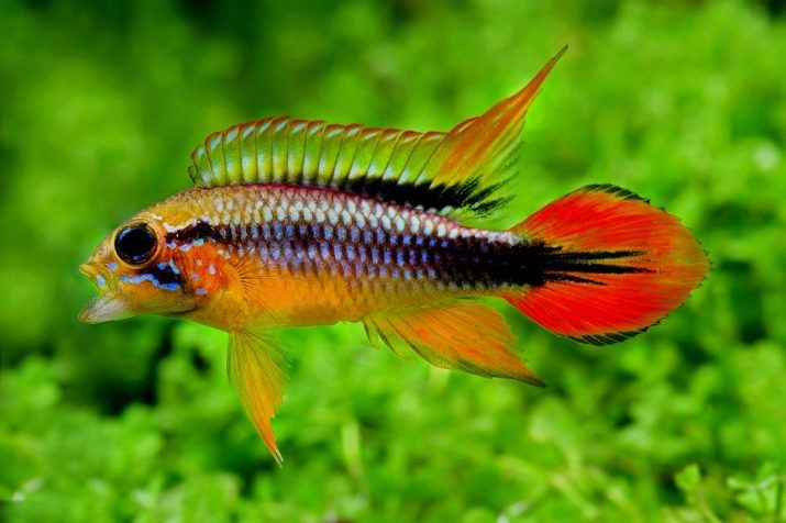 - Apistogram Agassica or cichlid Agassis also applies to small fish (5-7 cm), has a variety of colors, but yellow is considered the main color. A dark strip runs along the length of the whole body, the fins also have a darker border and patterns of dots of the same tone. Males have a brighter palette and elongated fins.
