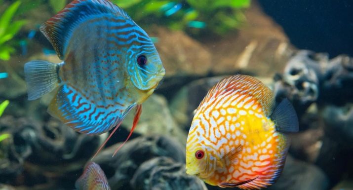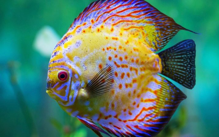 - Discus characterized by the presence of several species, which differ in color and various patterns on the scales. The body of the discus, strongly compressed on the sides, has a rounded shape. The dorsal and anal fins are located symmetrically, almost along the entire length of the body, but on the chest they are thin and elongated. The fish are quite large, about 25 cm in length.