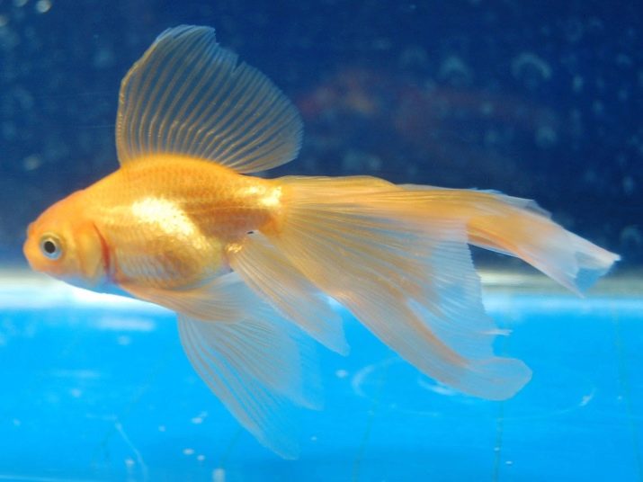 Even more popular among artificially cultivated varieties is veiltail. It’s easy to recognize him - these goldfish are perceived as a ball or egg, crowned with a large head. Vail tails can grow to 0.2 m. The longest life span is 15 years. Scales are not always present. Elongated fins have a small thickness. The tail is formed by several fused lobes, and together they look like a veil or a magnificent dress.