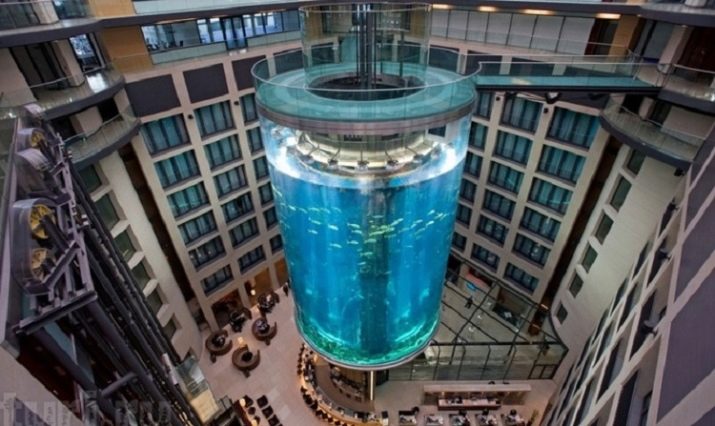 - While you are puzzling over how to combine two types of fish in one aquarium, At the Radisson Hotel in Berlin, Germany, the aquarium is populated by 56 species at once! This cylindrical pond is considered the largest in the world; its height alone is 25 meters.