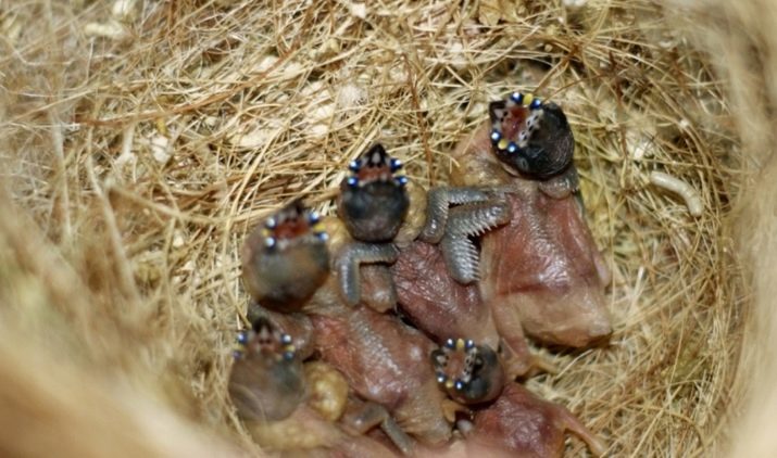 However, in the conditions of the city, when keeping amadins at home, it will be extremely difficult to create similar conditions for them, therefore, breeders will need to make every effort to obtain offspring. It is possible to maintain heat for the chicks by lighting devices or to allow the offspring of guilds to grow other birds, provided that they exist.