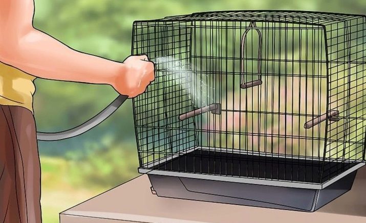 The frequency of cell harvesting is an issue that is decided individually in each case. Everything will depend on the number of birds and their behavior. However, to avoid unpleasant situations, the pallet in the cage should be cleaned every day. As for the planned washing of the entire enclosure, such work can be carried out once a week. The essence of the general cleaning will be reduced to washing the poles, swings, rods of the cage itself. At this time, the birds should be temporarily planted. It is not recommended to use any special means for washing, it is most correct to carry out the treatment with a soapy solution, after which, pour over all the elements with boiling water and wipe dry.