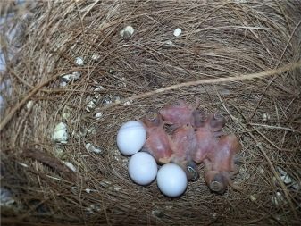 The number of eggs laid in most cases is from 2 to 7 pieces. Both birds incubate eggs. The incubation period takes from 14 to 16 days. During this period, a touching sight appears before the eyes of the owners. As soon as the chicks hatch, they are completely defenseless, fragile and vulnerable. Kids are covered with a rare fluff, they have tiny sizes. At this time, the chicks are still blind. They usually open their eyes only after a week.