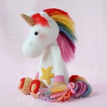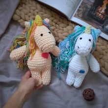 The mane and tail are made with spirals of 50 loops. Enough for 15-20 pieces per head and tail. Also, they can be made simply from threads. For the horn, 4 loops are typed into the magic circle, and then a gradual increase is made along a pair of loops until their number reaches 12.