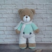 The top pair also knits from the amigurumi ring, with an increase in 2 rows of 6 loops, 3 and 4 circle unchanged. At 5, 6 and 7 columns are reduced. Next 5 and 6, the remaining loops are pulled together, padding is not needed. A flexible wire is inserted into the body so that its ends become a frame for the legs and arms of the bear. They are bent with pliers, inserted into the product details. The paws are sewn, completely masking the wire frame. Bear is ready.