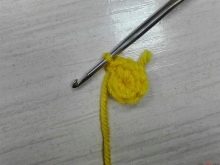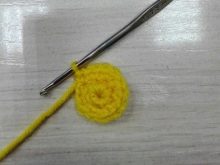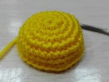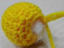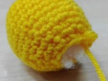 Knitting chicken should begin with the head. You need to take a hook and yellow yarn. In total, 19 rows have to be knitted (from 3 to 19 to knit sbn):