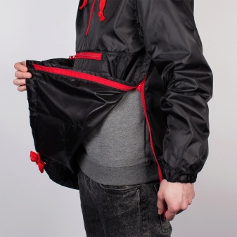 For added convenience, a kangaroo pocket has been added to the chest patch pocket from below. Ventilation is provided by openings in the armpits and side zippers. Such anorak weighs very little and folds to the minimum size - in a compact handbag.