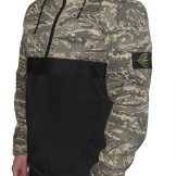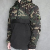 The model is made of different fabrics. Top and hood - lightweight cotton muslin with polyurethane impregnation (high degree of protection against moisture). Bottom - tarred linen-nylon fabric with camouflage print (easy protection against moisture). All zippers on this jacket are hidden, they are supplemented by buttons.